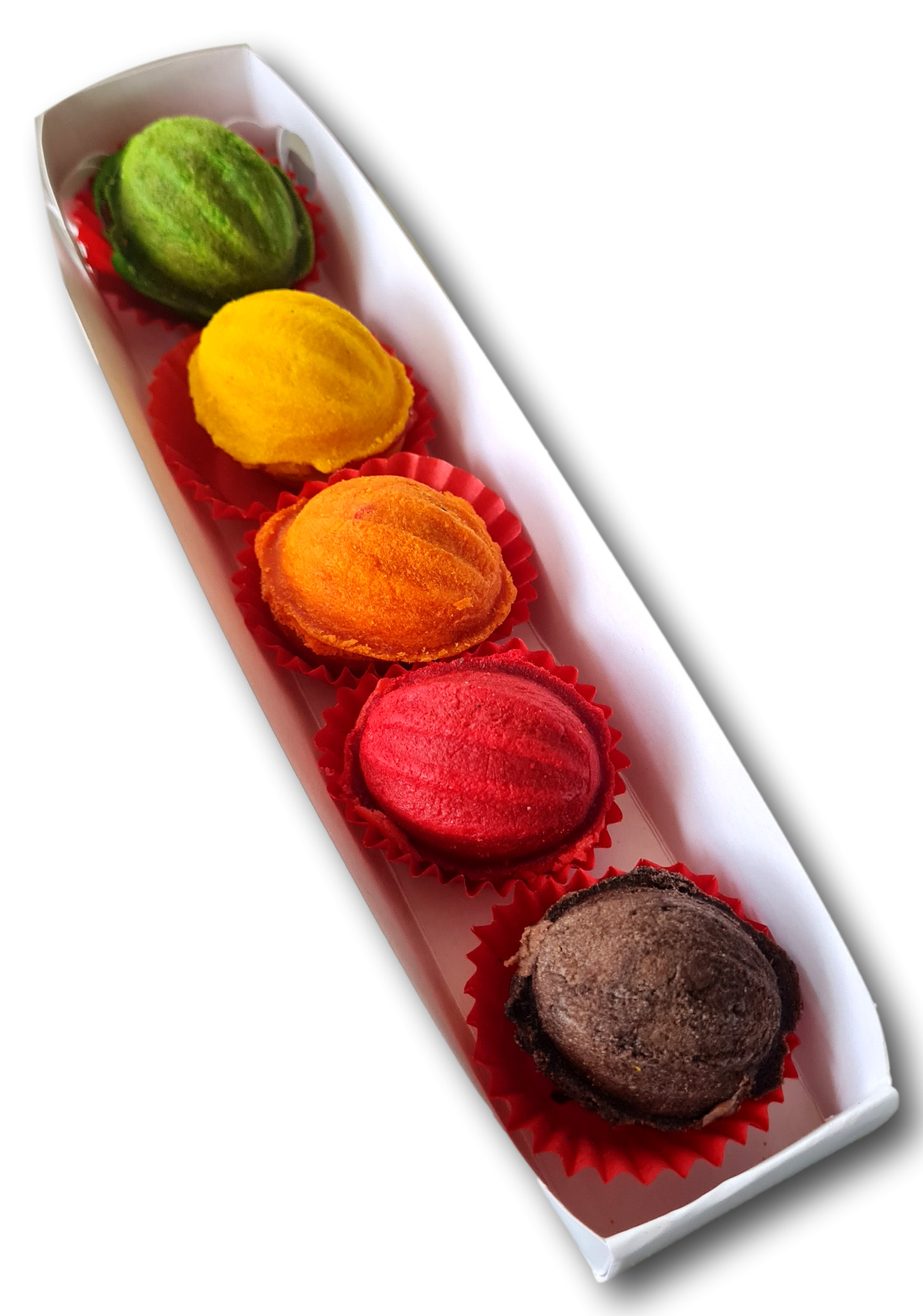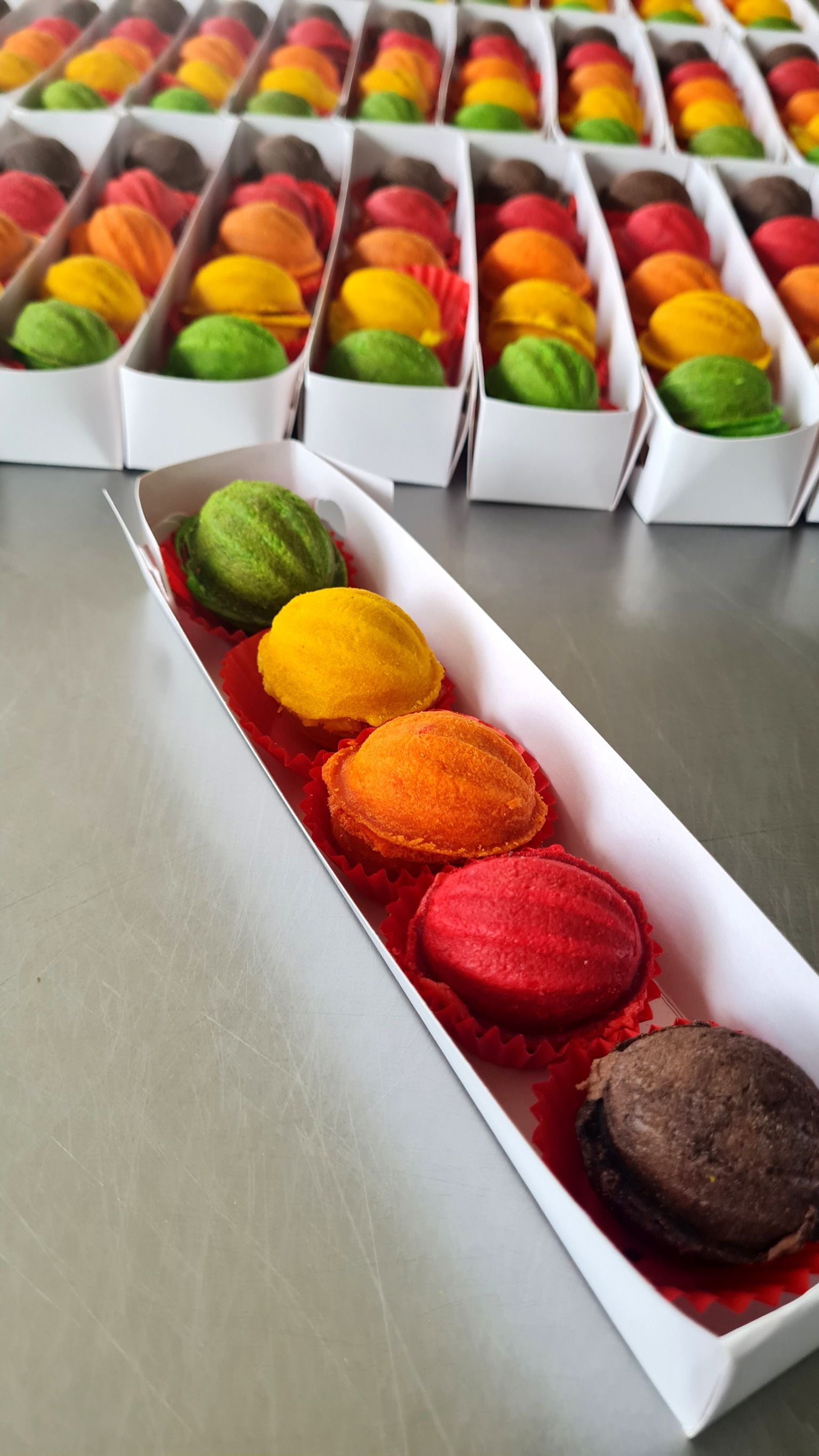 Descoperă un deliciu plin de culoare și savoare: **nucile fragede**, umplute cu un **miez dulce de jeleu de căpșuni** și **creme fine în patru arome irezistibile** – fistic, lămâie, portocală și cacao cu rom. Fiecare nucă este atent colorată și finisată manual, transformând desertul într-o adevărată bijuterie dulce.