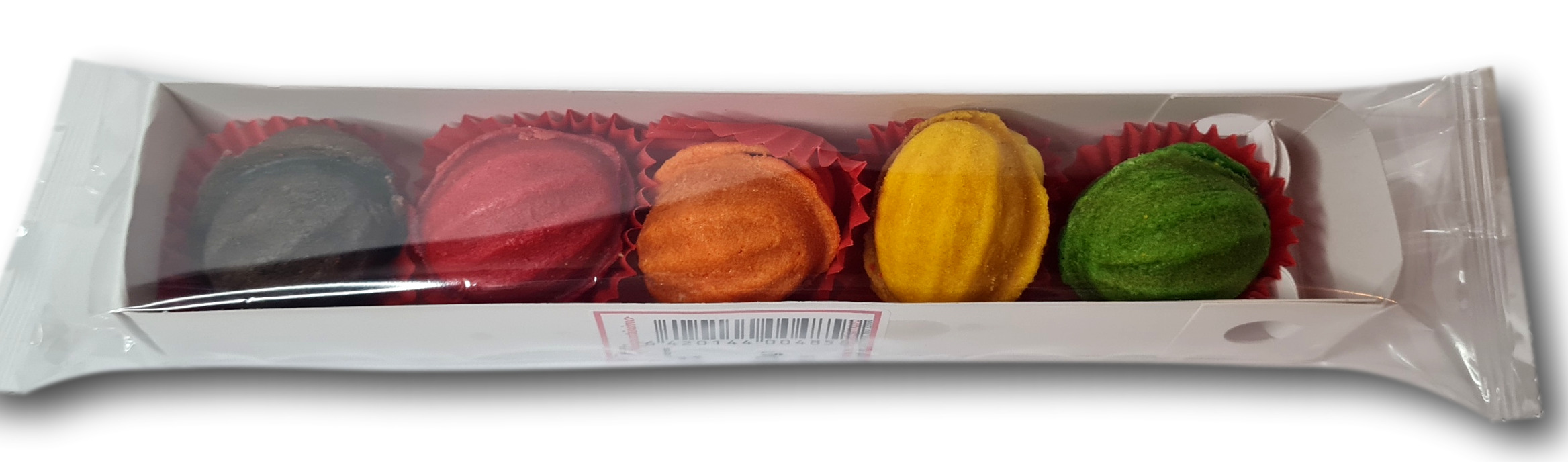 (RO) Ingrediente: făină de grau, ulei vegetal rafinat, zahar, glucoza lichida, oua, agenti de afanare ( bicarbonat de amoniu, bicarbonat de sodiu ), aroma vanilie, crema ( zahar, ulei vegetal rafinat, glucoza lichida , cacao, aroma rom, conservant ( propionat de calciu ), aroma fistic, aroma capsuni, aroma portocale, aroma lamaie), jeleu( zahar, glucoza, aroma capsuni, pectina, amidon de cartof, colorant alimentar, sare de lamaie, sorbat de potasiu).